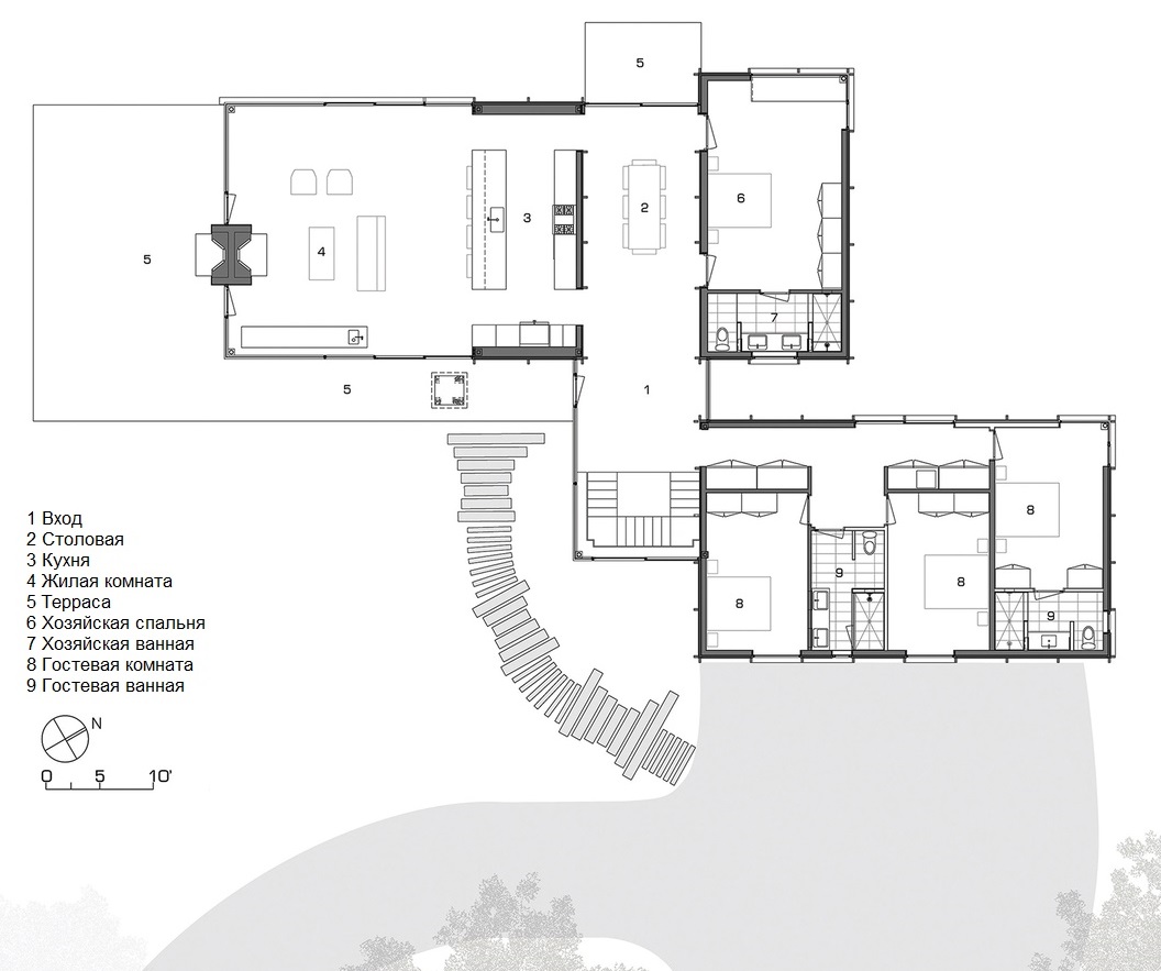 Выделение зон постоянного проживания, готевого проживания, открытые пространства дом-улица, хозяйственные и технические помещения.